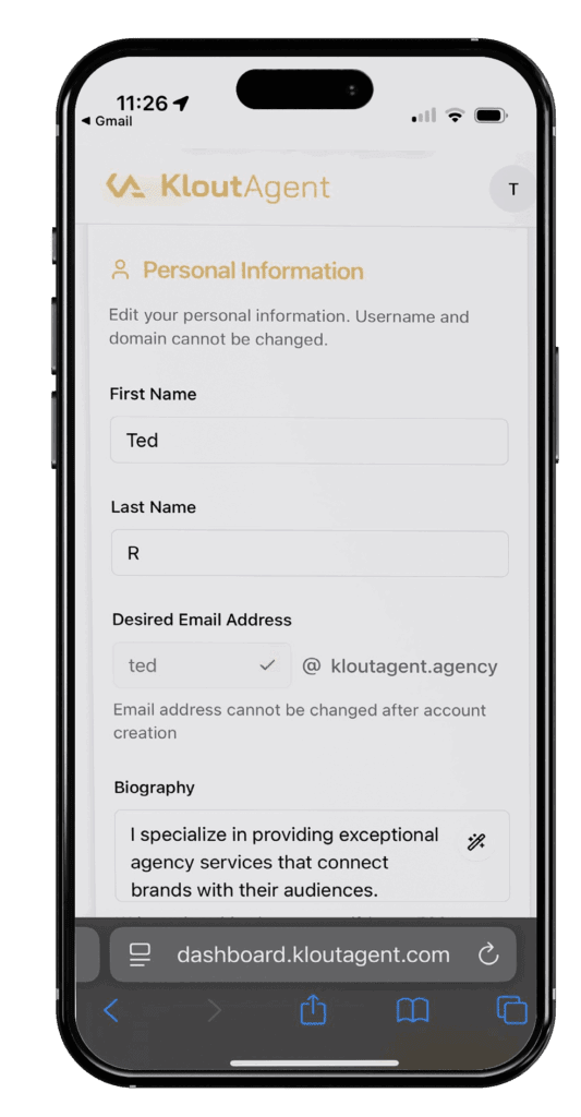 Every creator also receives a dedicated username@kloutagent.agency email, giving you a professional identity when working with brands.